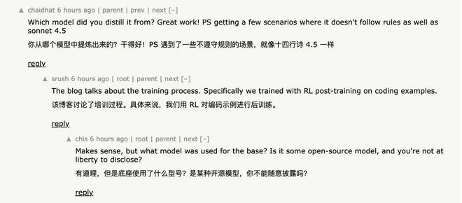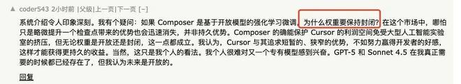 但他们的表述里有个关键细节始终不清楚:究竟是从零训练,还是基于已有的开源权重(如Qwen、GLM)继续训练?Sasha Rush一直在Hacker News回答提问,但至今都回避了关于底座模型的直接问题。有人直问“Composer是否只是对开源基础模型的微调?”她的答复是:“我们的主要精力放在强化学习的后训练阶段。我们认为,这是让模型成为强互动智能体的最佳路径。”