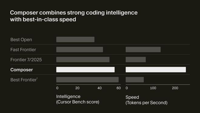 Composer的最大亮点在于其速度设计目标。他们在公告中称其速度“比同等智能的模型快4倍”。模型还专为Agentic工作流训练,支持由自主编码代理协同进行的规划、编写、测试与代码审阅。