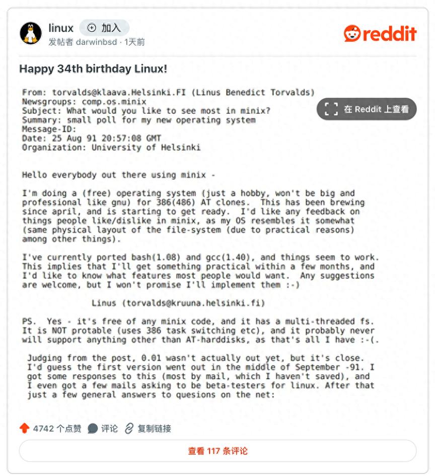 上图是 Torvalds 在 comp.os.minix 新闻组上发表的第一篇关于 Linux 的帖子。如今,这位以尖刻、暴躁、易怒著称的人物,在这篇具有历史意义的 Linux 里程碑帖子中,显得相对温和、顺从且易于理解。